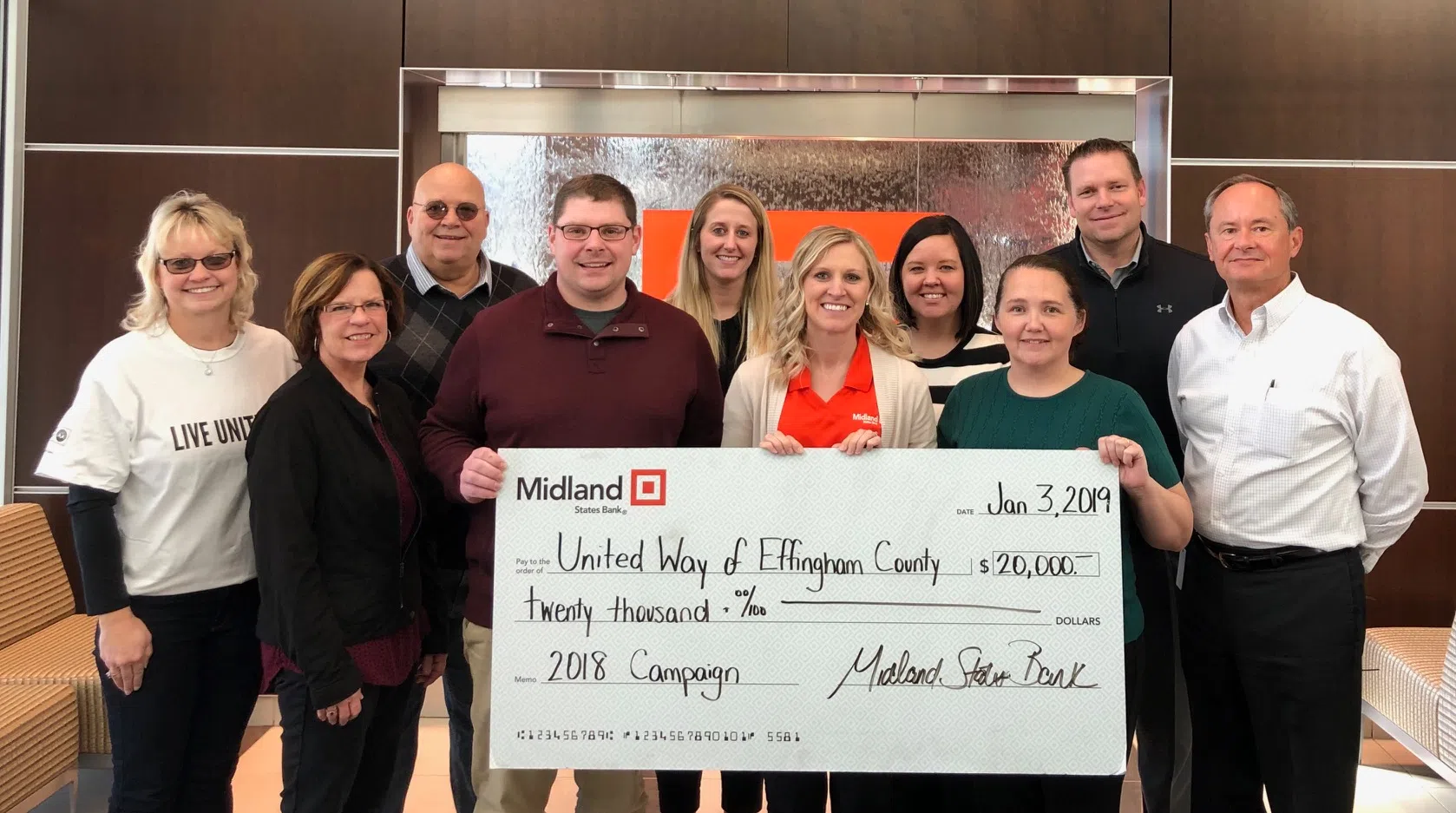 Midland States Bank employees presented a check to Patrick Kreke, Campaign Chair, and representatives from United Way of Effingham.