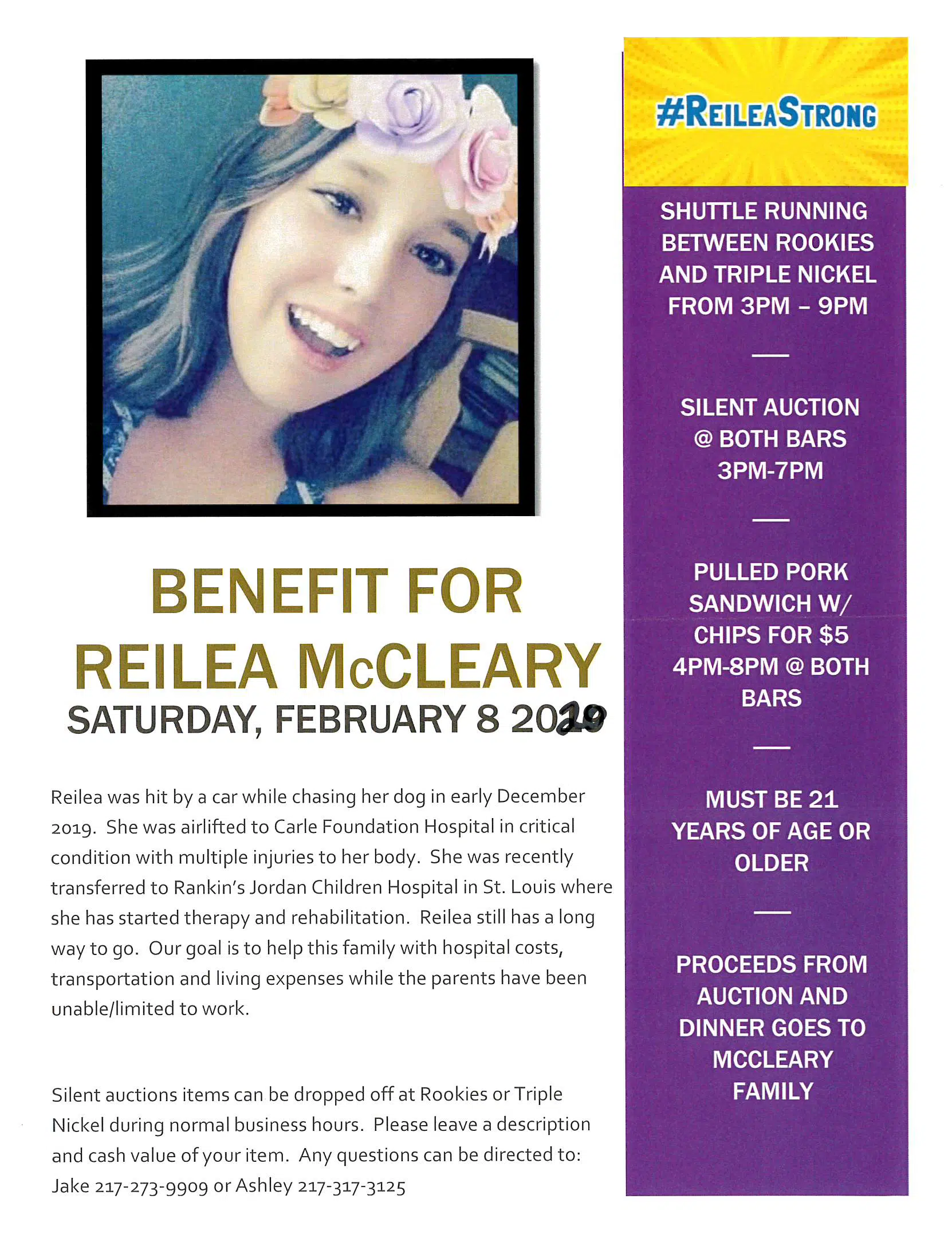A benefit for Reilea McCleary will be held February 8th from 3:00-9:00 p.m., with a shuttle running between Rookie’s and the Triple Nickel. Pulled pork meals will be available for just $5.00 from 4-8pm, and each bar will have a silent auction from 3-7pm. Must be at least 21 to attend. If you’d like to donate an auction item, please drop off at either location during business hours. For more information, please call 217-273-9909.