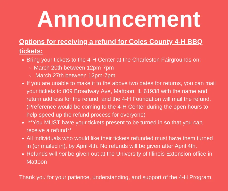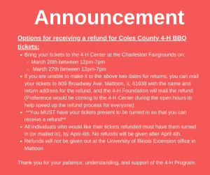 The Coles County 4-H BBQ scheduled for April 4, 2020 has been cancelled. Here is how you can obtain a refund