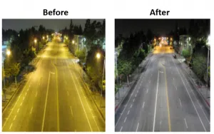 The before and after photo is an example of how LED streetlights brighten a street. Submitted photo: Ameren Illinois