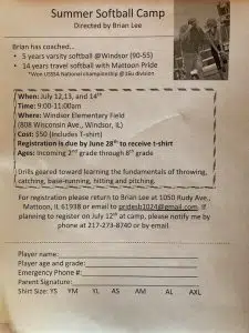 Brian Lee’s Summer Softball Camp will be held at Windsor Elementary field July 12th through 14th. Cost is $50 per player, and it’s open to players entering 2nd through 8th grade. For more information, email pridesb1024@gmail.com, or call 217-273-8740.