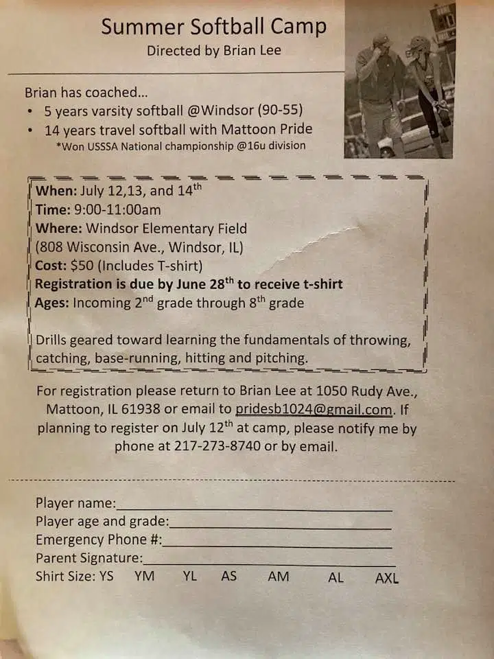 Brian Lee’s Summer Softball Camp will be held at Windsor Elementary field July 12th through 14th. Cost is $50 per player, and it’s open to players entering 2nd through 8th grade. For more information, email pridesb1024@gmail.com, or call 217-273-8740.