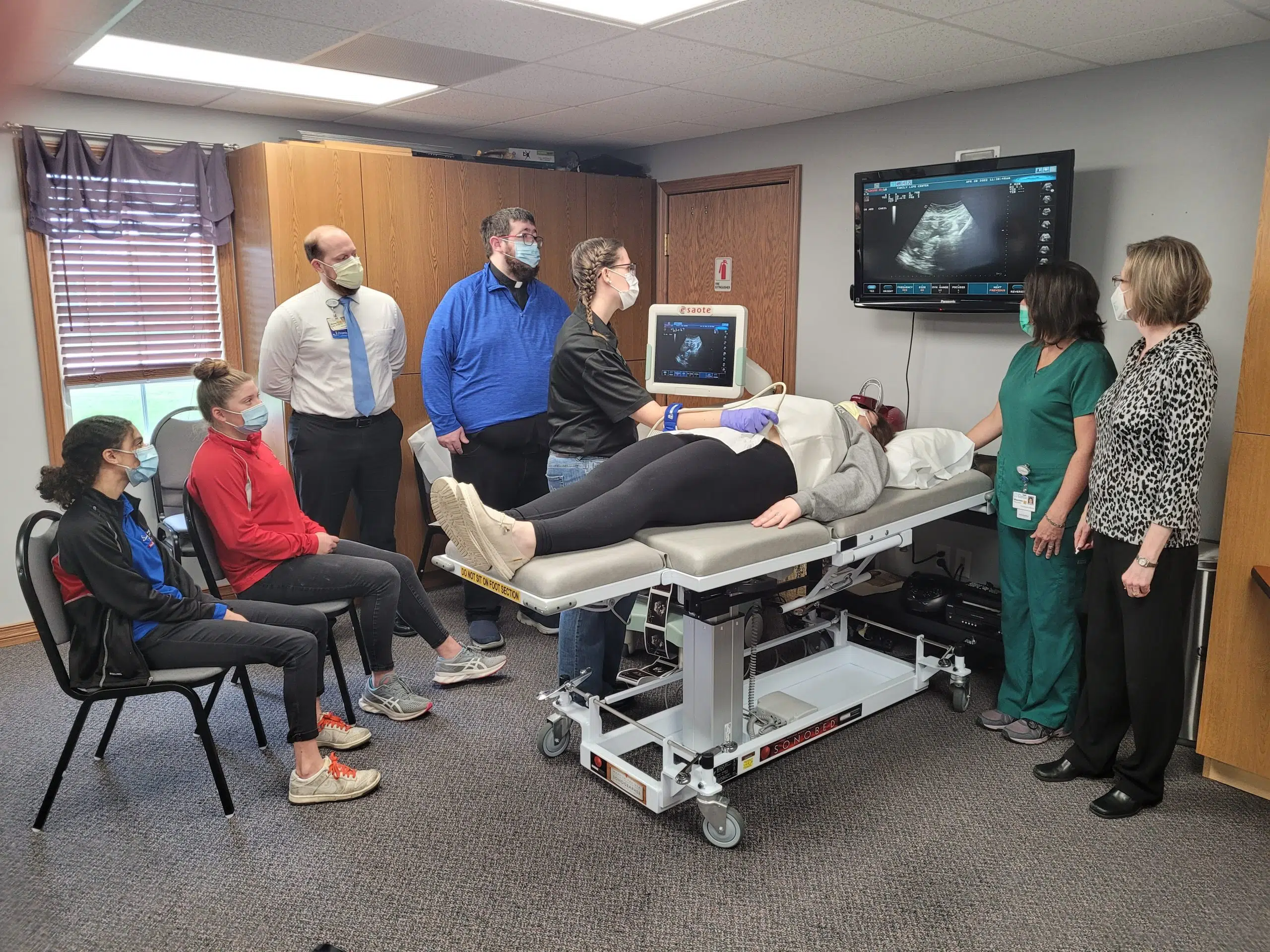 Alison Deters (center), ultrasound technologist from the Family Life Center and Maureen Habing (second from right), registered ultrasound technologist from HSHS St. Anthony’s Memorial Hospital, team up to show students from St. Anthony High School the development of Marissa Miller’s 17-week baby through an ultrasound. Observing the ultrasound are (left to right) Evitt Nashed and Kenzie Kabbes (seated), St. Anthony High School students; Mike Janis, executive director of outpatient and ancillary services, HSHS St. Anthony’s Memorial Hospital; Father Adam Prichard, hospital chaplain; and (far right) Valerie Kemme, project leader for Window to the Womb. Photo submitted by HSHS St. Anthony's.
