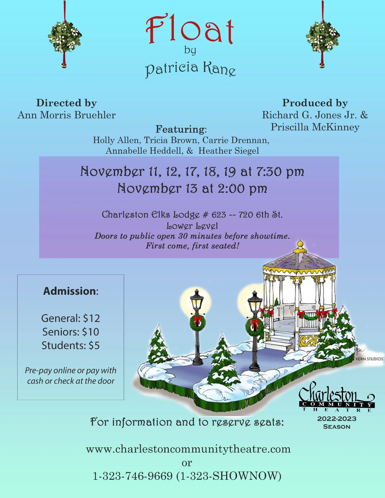 Float is presented in the Charleston Community Theatre’s space in the lower level of the Elks Club #623, 720 6th Street, Charleston, IL. Show times are at 7:30 p.m. on November 11, 12, 17, 18, 19 and at 2:00 p.m. on November 13. Tickets are $12.00 for adults, $10.00 for seniors and $5.00 for students. Tickets may be reserved by calling 1-323-SHOWNOW, or may be reserved or purchased online at charlestoncommunitytheatre.com.