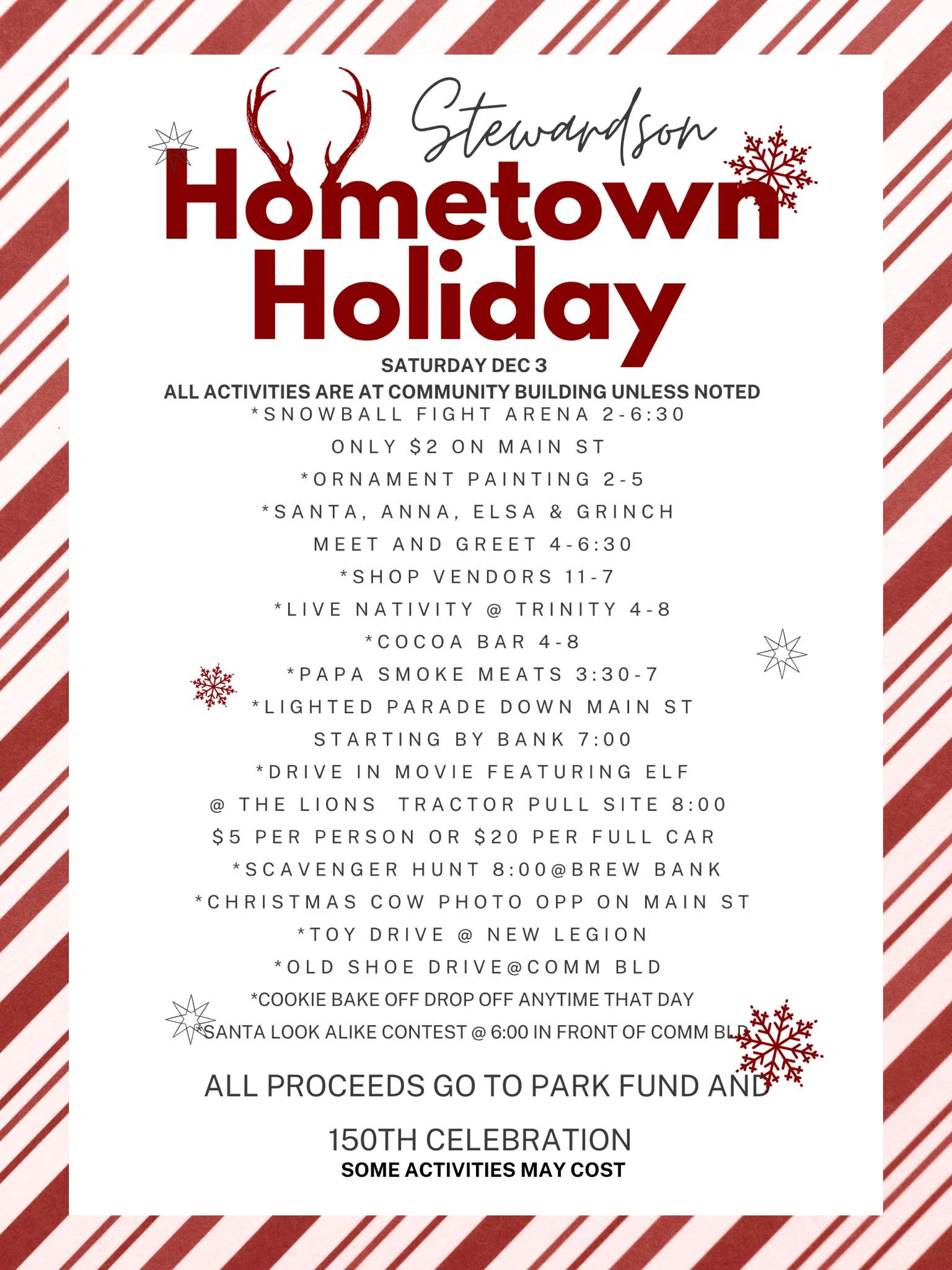 Saturday, December 3, 2022, is the Stewardson Hometown Holiday celebration. Lots of fun activities for all ages, including the snowball fight, drive-in movie, featuring “Elf,” scavenger hunt, Santa look-alike contest, ornament painting, live nativity scene, hot cocoa bar, and lighted parade.