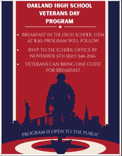 Oakland High School welcomes you to their annual Veterans Day program, on November 11, 2025. They will start with breakfast in the gym at 8:30 a.m., and the program will follow. Veterans can bring one...