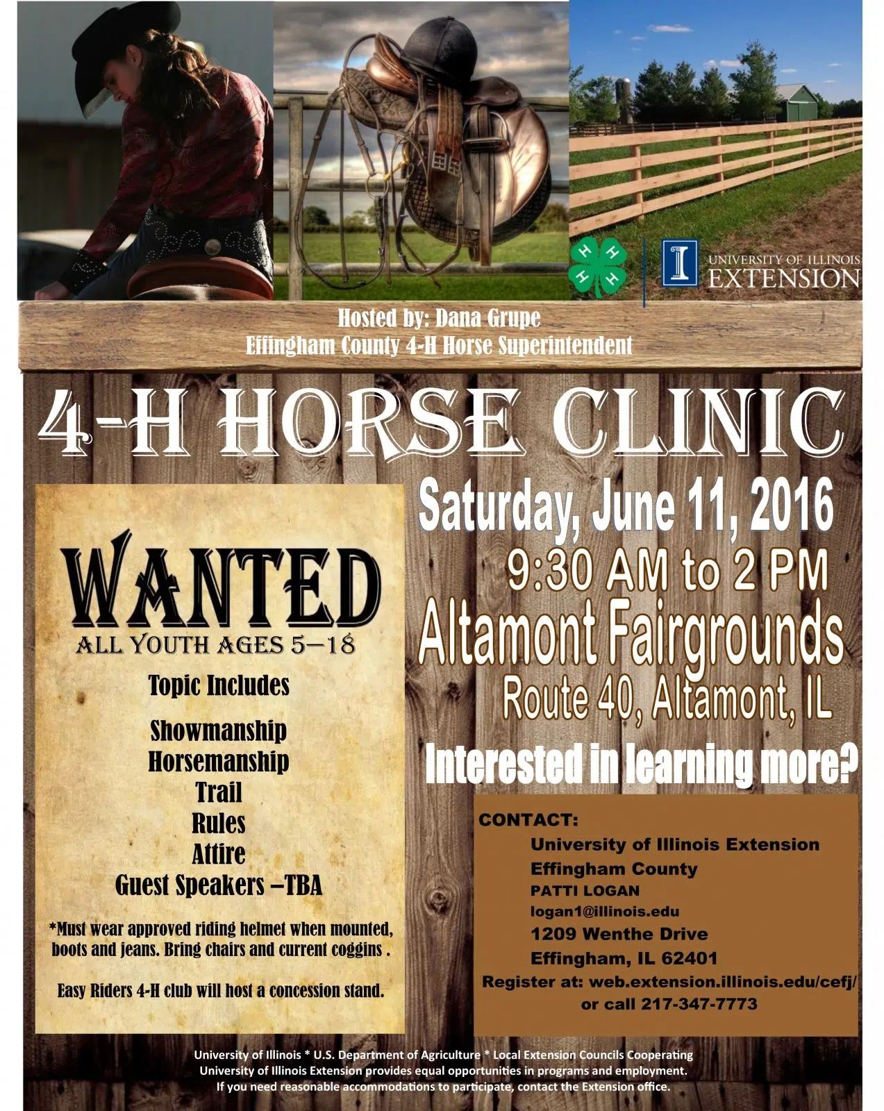 Effingham County 4-H Superintendent, Dana Grupe will host a 4-H Horse Clinic Saturday, June 11 from 9:30am to 2pm at the Altamont Fairgrounds on Route 40 in Altamont. Kids 5 to 18 are welcome to join ...