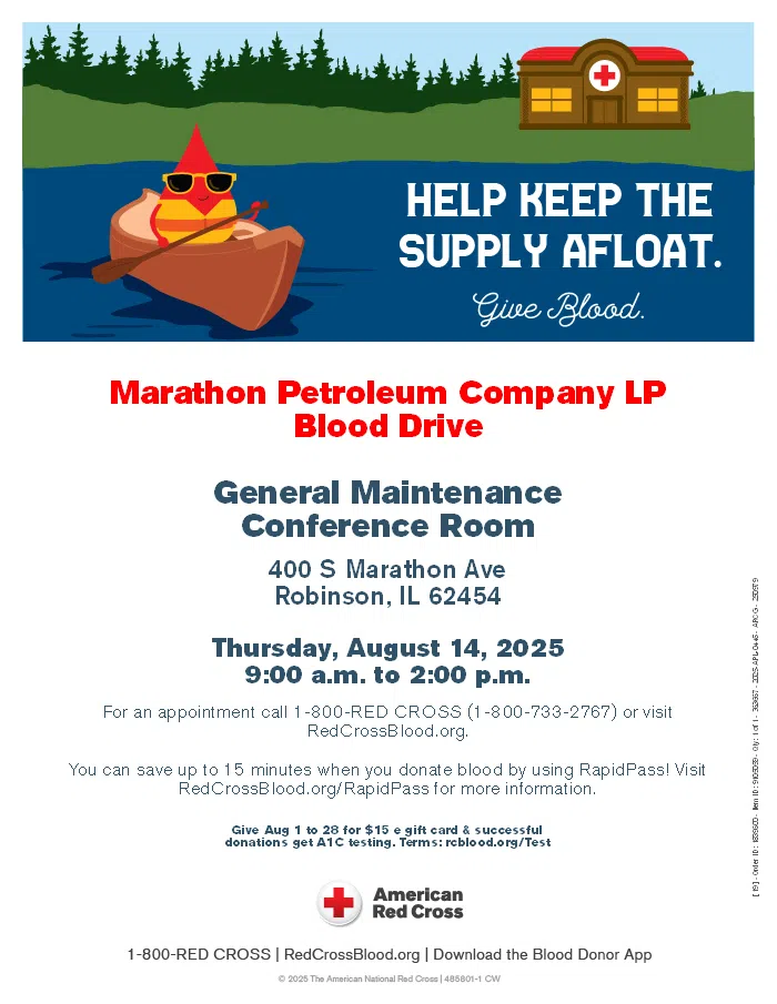 The heat is on to find blood donors! Come to give Aug. 1-28 and get a $15 e-gift card to a merchant of choice. Plus, the Red Cross will perform free A1C testing, commonly used to screen for prediabetes and diabetes, on successful donations in August (one result per donor in a 12-month period). See rcblood.org/Test for details.