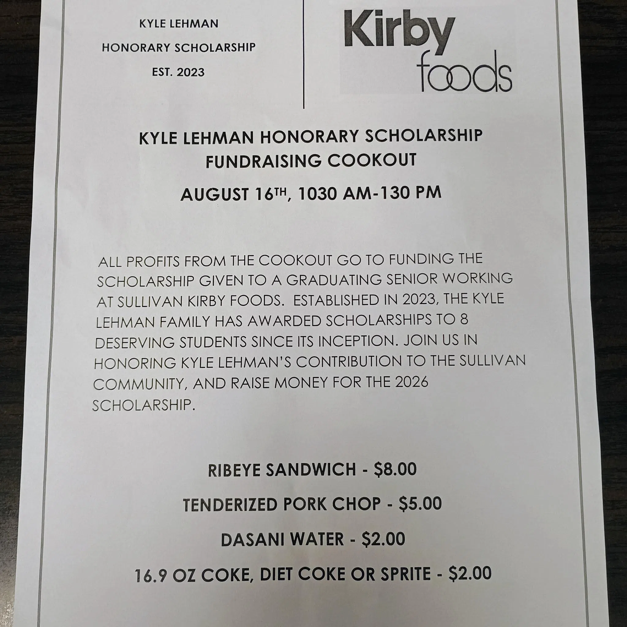 A cookout to benefit the Kyle Lehman Memorial Scholarship will be held this Saturday, from 10:30-1:30, at Kirby Foods in Sullivan. Ribeye sandwiches are $8.00, and pork chop sandwiches are $5.00. Bottled water, Coke, Diet Coke or Sprite are $2.00 each.