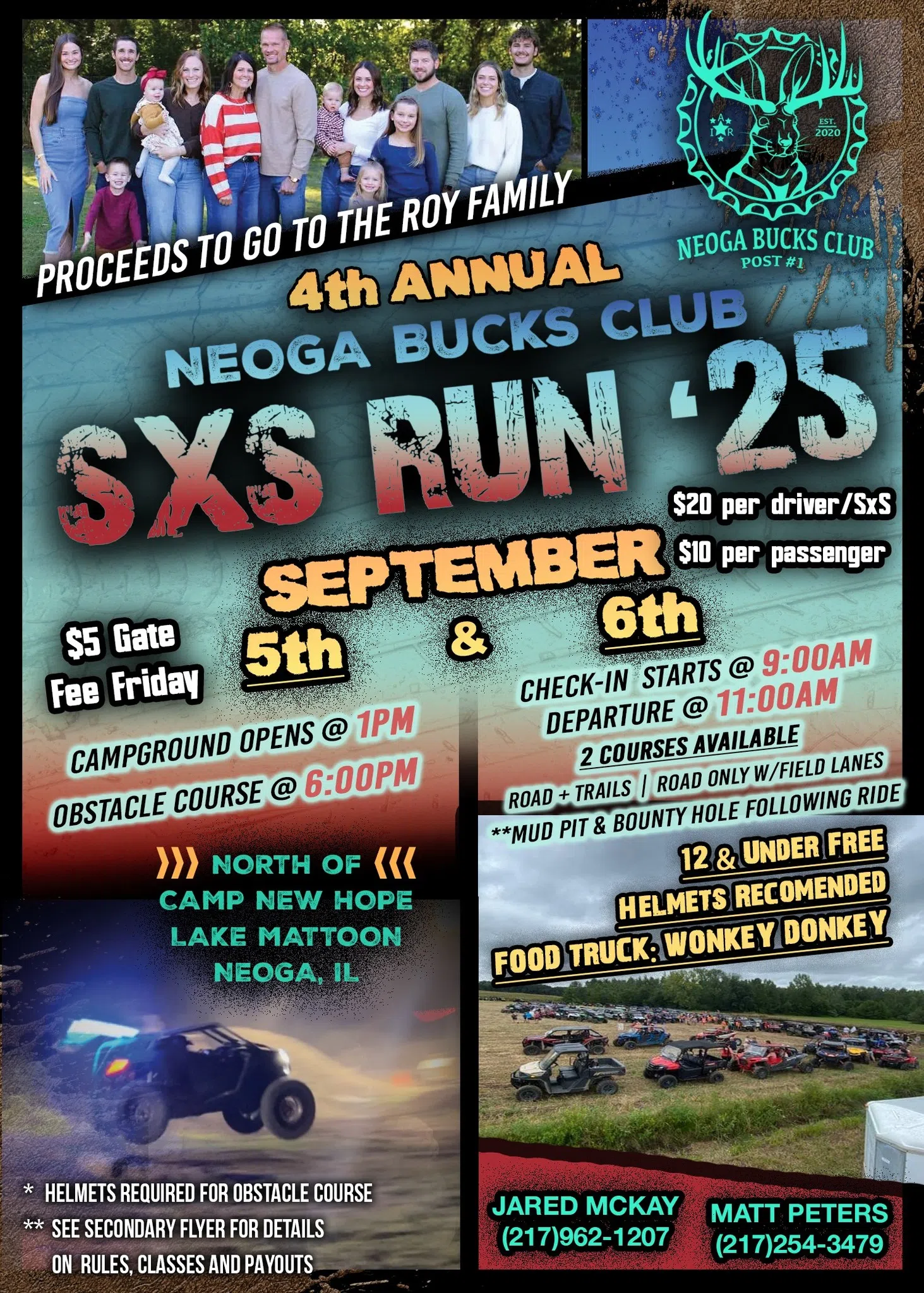 Get down and dirty at the Neoga Bucks Club’s four annual Side-by-Side Run, just north of Camp New Hope! It’s twenty bucks per driver, ten per passenger, and all for a great cause—helping the Roy family support Trevor’s recovery. The campground opens Friday at one, obstacle course at six, then on Saturday, check-in at nine, the ride rolls at 11 with two wild courses, a mud pit and the bounty hole! Don’t miss the mud, the madness, and the mission
